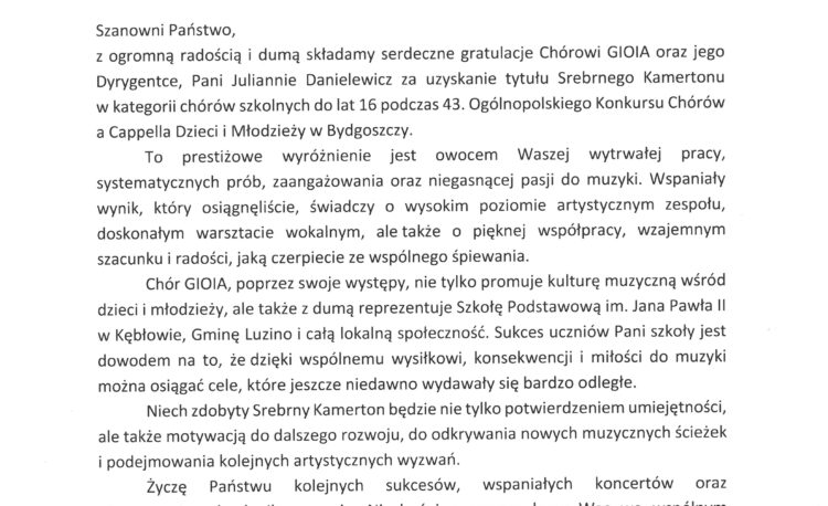 W dniu 13 listopada 2025 oku wizytator Kuratorium Oświaty w Gdańsku przekazała na ręce dyrektora szkoły list gratulacyjny dla szkolnego chóru GIOIA za uzyskanie …