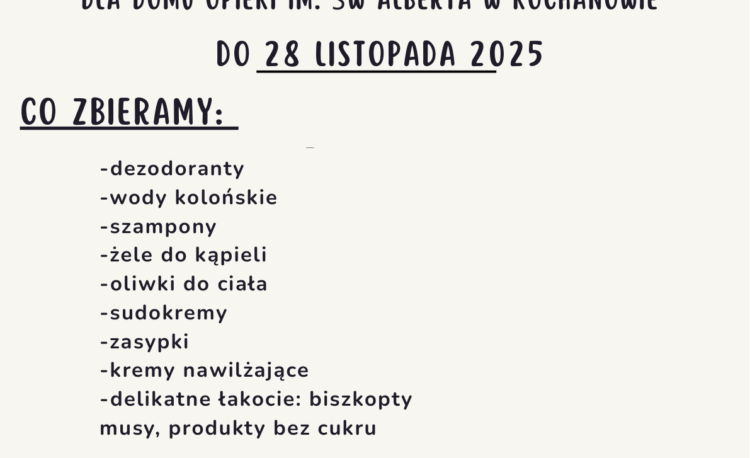 Ruszyła II Zbiórka Listopadowa organizowana w naszej szkole na rzecz Domu Opieki św. Alberta w Kochanowie. Zachęcamy wszystkich do włączenia się. Akcja trwa do 28 listopada. Podpisane …