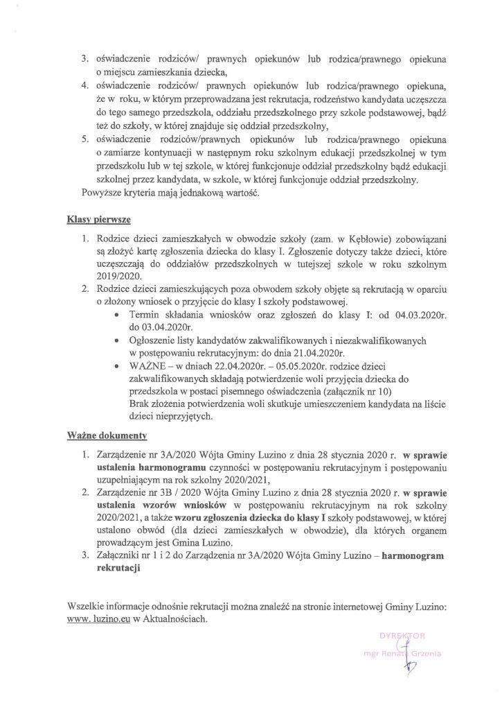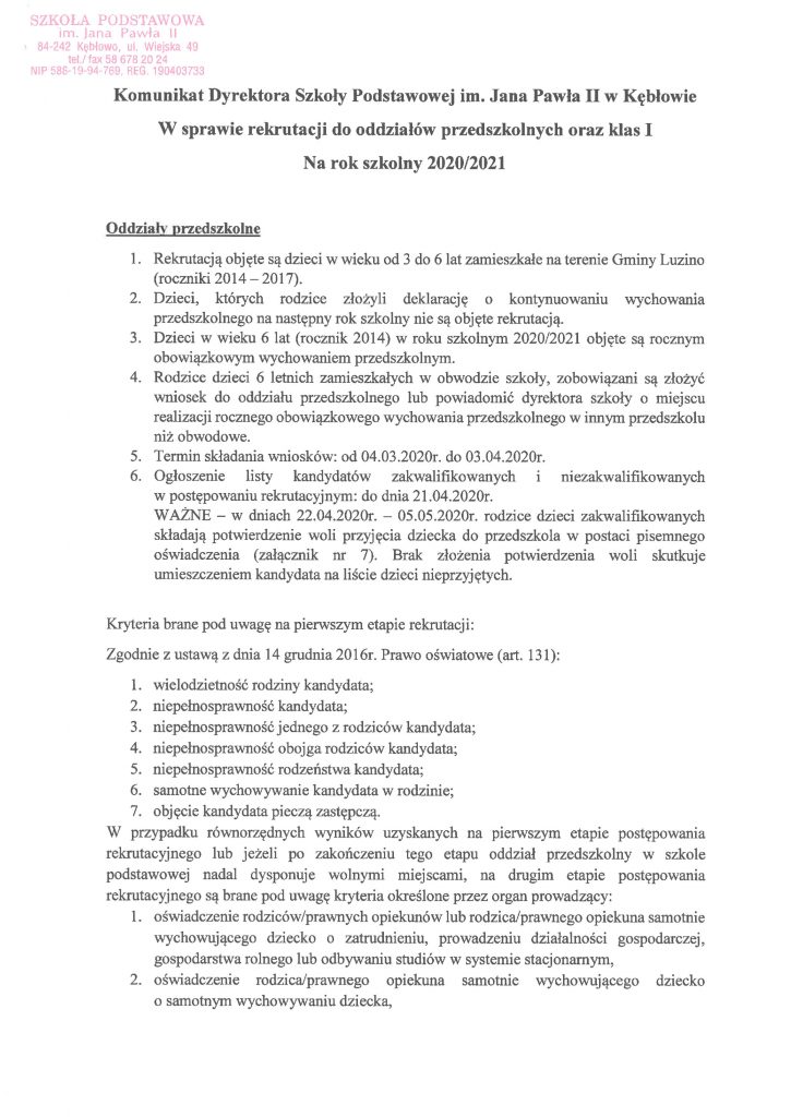 Komunikat Dyrektora Szkoły w sprawie rekrutacji oddziałów przedszkolnych oraz klas I na rok szkolny 2020/2021 11 mar,2020 admin