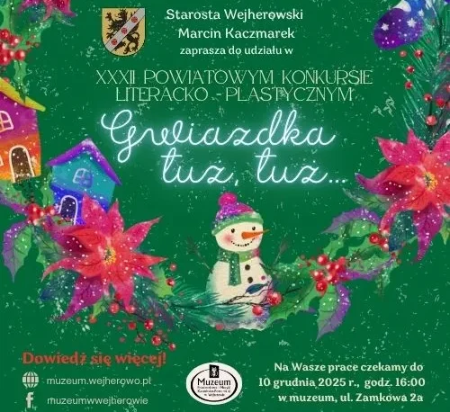 Z radością zapraszamy uczniów naszej szkoły do udziału w XXXII Powiatowym Konkursie Literacko-Plastycznym „GWIAZDKA TUŻ, TUŻ…”, organizowanym przez Starostę Wejherowskiego, Marcina Kaczmarka.