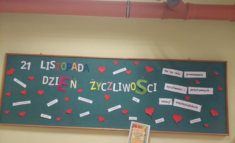 Dodatkowo, bibliotekarz podczas lekcji odwiedził większość klas i zachęcał do korzystania z biblioteki. Przeprowadził krótkie pogadanki o byciu życzliwym dla drugiego człowieka – podkreślając fakt, że powinniśmy być życzliwi i wspierać się nie tylko w tym dniu, ale tak naprawdę codziennie. Przy bibliotece szkolnej została przygotowana gazetka przypominająca o tak ważnym aspekcie życia w społeczeństwie.