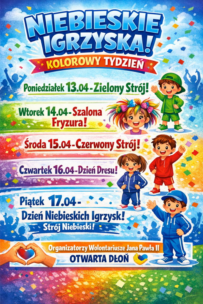 „Niebieskie Igrzyska – Kolorowy Tydzień” to wyjątkowa inicjatywa promująca integrację, życzliwość oraz radość wspólnego działania. Każdego dnia uczniowie i uczestnicy akcji włączają się w zabawę poprzez kolorowe lub tematyczne stroje, podkreślając otwartość, różnorodność i wzajemny szacunek.